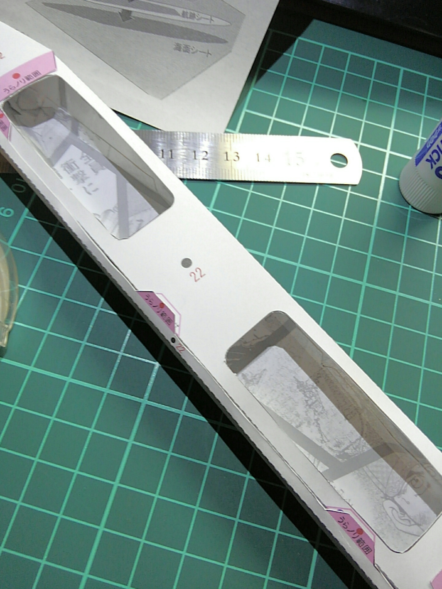 切り取って穴になってる部分は、船底なんかの糊付けのときに作業しやすいように前後二箇所を切り抜けるようになってる。